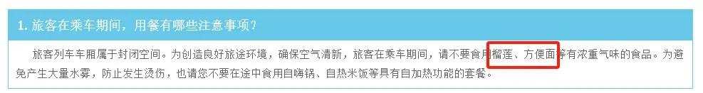 記者查詢了12306官網,發現在旅客出行指南注意事項中確實指出:由于旅客列車車廂屬于封閉空間,為確保旅途環境良好和空氣清新,乘車期間請勿食用榴蓮、方便面等氣味濃重的食品。
