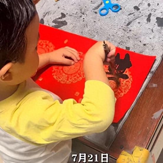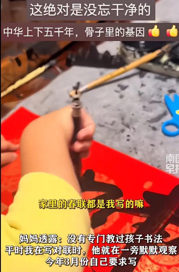 這事其實七月二十幾號傳開的。孩子媽媽說以前都是她寫春聯,孩子一直看。今年年后突然自己拿筆寫。家里人挺意外的,問過早教老師,都說這年齡能寫基本算少見。不過孩子每天就是看對聯、讀對聯,還老纏著要拿筆。