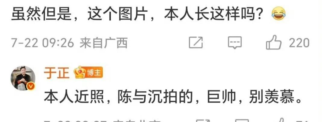 近日,于正發(fā)微博時(shí)配了一張自己的寫真,立刻引起了網(wǎng)友們的熱烈討論。從照片中可以看出,于正本人確實(shí)非常帥氣,網(wǎng)友們紛紛表示:“這個(gè)圖片,本人長(zhǎng)這樣嗎?”