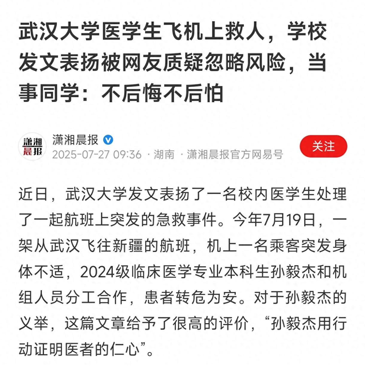 先別急著站隊,把事兒捋一遍。7月19號,武漢飛新疆的航班上,廣播突然喊“有沒有醫生”。武漢大學臨床醫學大二學生孫毅杰聽到后,沒多想就過去了。乘客是個二十來歲的姑娘,說頭暈、手腳發麻,之前坐飛機也犯過,那次還逼得飛機備降。