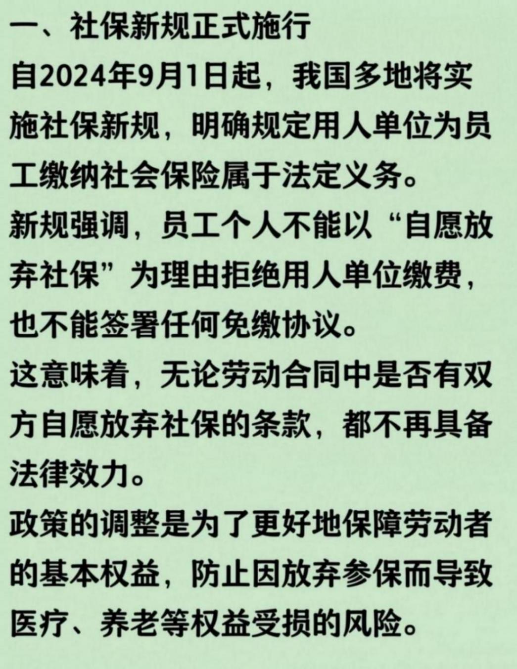 隨著社會保障制度的不斷完善,社保新規于9月1日起正式實施。這一新政明確規定,個人將不能再自愿放棄繳納社保,單位若拒不為員工參保,將面臨嚴厲的經濟賠償。此次調整旨在切實維護勞動者的切身利益,杜絕企業規避責任行為,同時也為廣大職工的醫療、養老等基本保障織起更密實的“安全網”。新規的落地不僅關乎每一位勞動者的權益保障,更昭示著國家對于社會保障體系的持續重視和不斷強化。