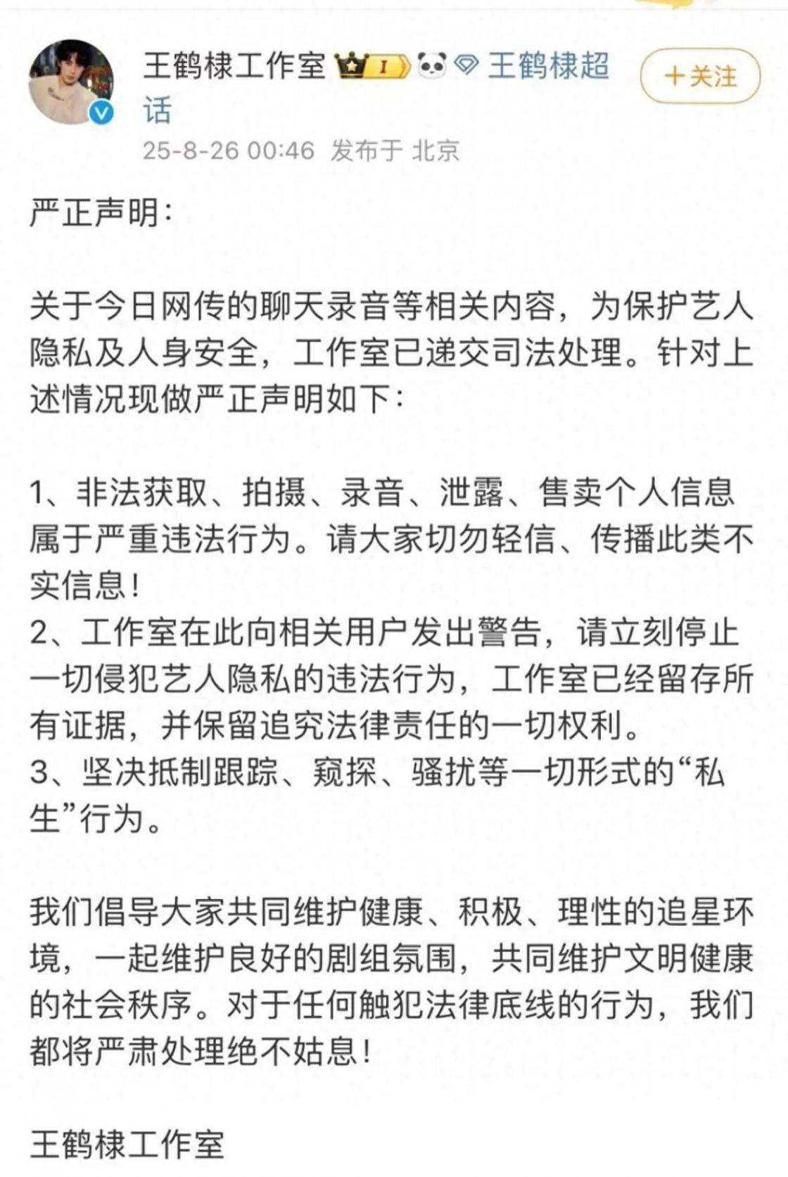 26日凌晨,王鶴棣工作室發(fā)嚴(yán)正聲明,明說“非法獲取、錄音、泄露個(gè)人信息是嚴(yán)重違法”,已把證據(jù)交司法機(jī)關(guān)。聲明強(qiáng)調(diào)抵制“跟蹤、窺探等私生行為”,警告侵權(quán)用戶“立刻停手”。發(fā)稿前,涉事賬號(hào)被微博禁言,理由是“違反社區(qū)公約”。