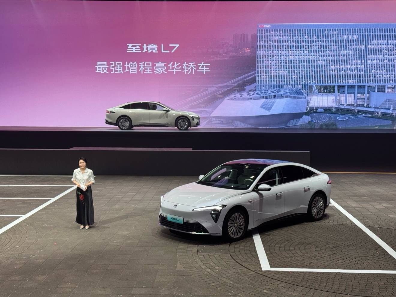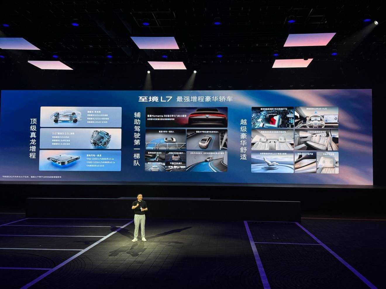 車身尺寸方面,至境L7長寬高分別為5032/1952/1500毫米,軸距達3000毫米,提供玄巖黑、月影灰、云光白、金沙米、星云紫、晶鉆紫六種配色選擇。動力系統采用增程式架構,搭載252千瓦電動機與115千瓦1.5T增程器,油箱容積60升。CLTC工況下純電續航302公里,綜合續航1400公里,零百加速僅需5.9秒,最高時速200公里。底盤采用前雙叉臂后五連桿獨立懸架,并配備RTD連續可變阻尼減震器,兼顧操控性與舒適性。