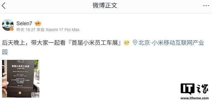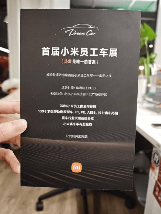 10 月 10 日消息,小米中國區智能硬件市場負責人 @Selen7 昨日曬出邀請函,首屆小米員工車展將于 10 月 11 日 19:00 舉行,活動地點位于北京小米科技園下沉廣場草坪區。