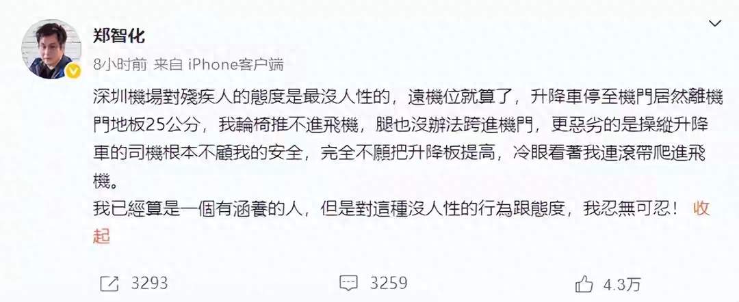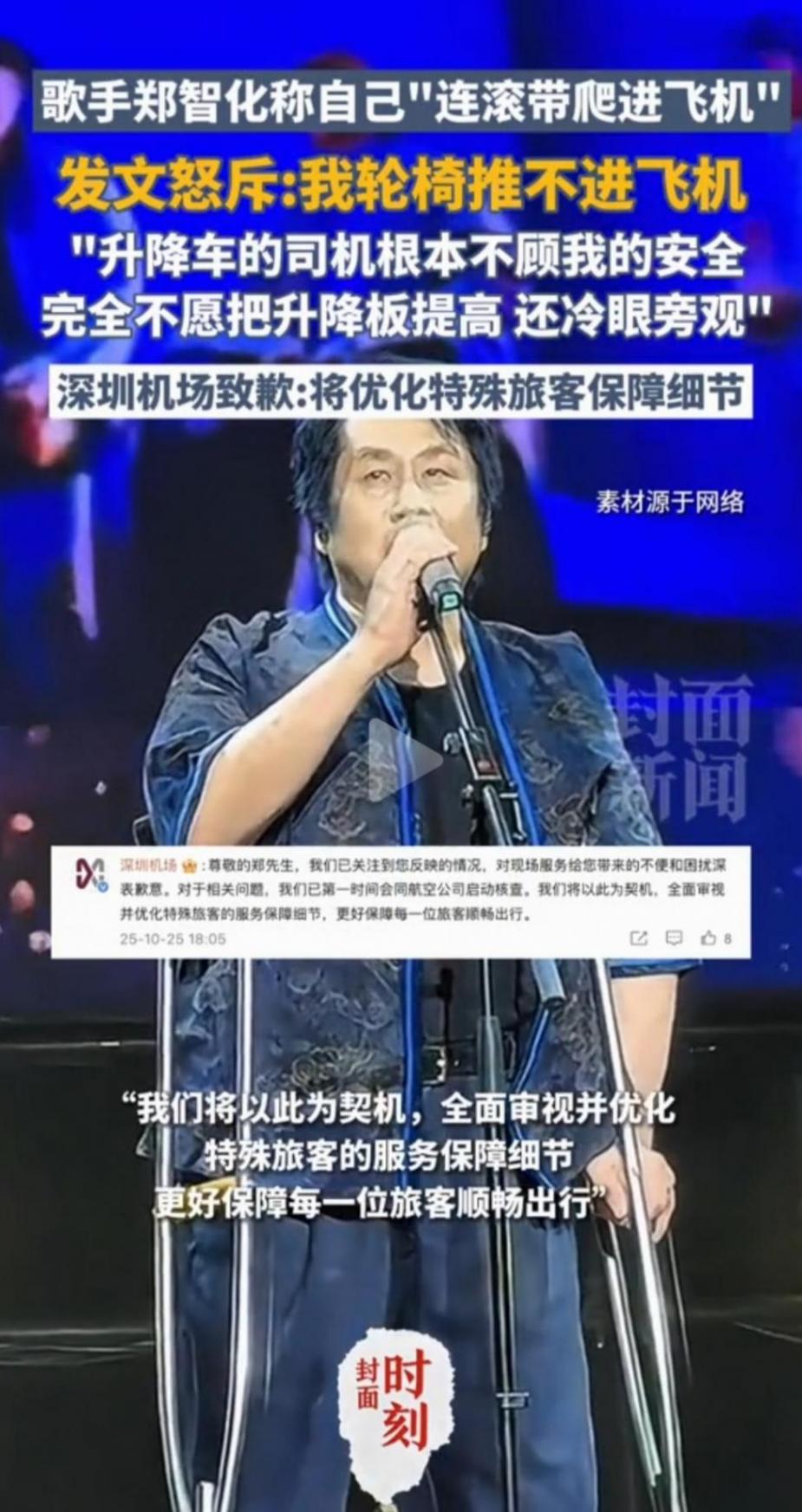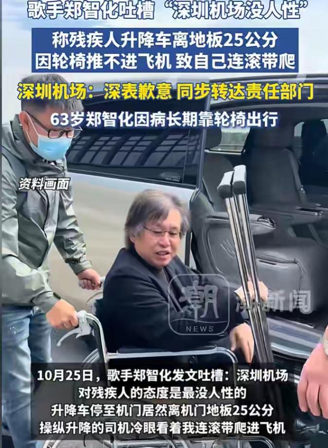 25日午后,歌手鄭智化發出微博附帶定位信息,文字內容講述著在深圳機場上演的一幕“連滾帶爬”遭遇記,升降機同飛機機艙之間存在25公分落差狀況發生時,旁觀的操作員臉上毫無溫度地觀察著這一切,2小時之后話題標簽#明星殘疾人登機困境事件被推到了第七名熱搜榜上,在4個小時內就收獲了23萬條次轉發記錄,這位曾演唱過歌曲《水手》并已年滿62歲的老歌星以自己身體力行的實際行動揭露出當代文明社會所隱藏的創口來。