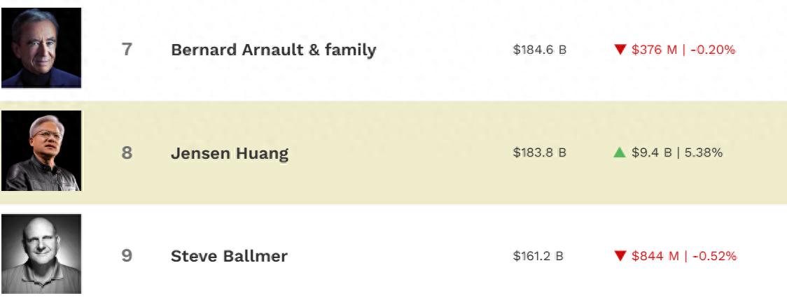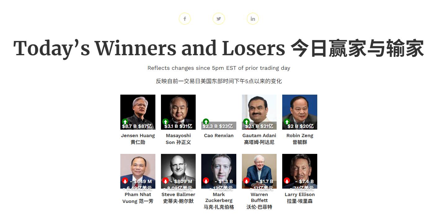 福布斯實時富豪榜還列出了財富變化的今日贏家,受英偉達股價上漲助力,黃仁勛成為最大贏家。