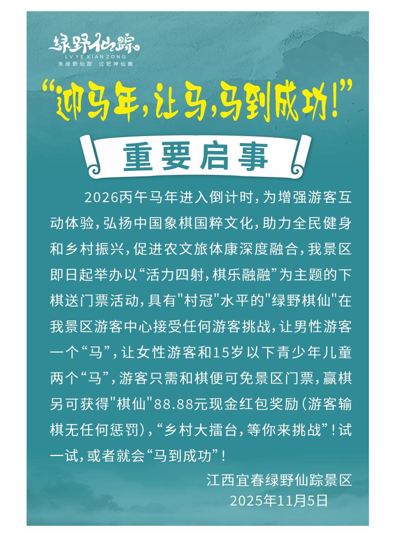 據(jù)悉,導(dǎo)演張一一每天下午坐鎮(zhèn)景區(qū)接受游客挑戰(zhàn),男性游客讓單馬,女性游客和15歲以下青少年兒童讓雙馬,游客在被讓馬的情況下只需下成和棋便可免景區(qū)門票,贏棋另外可以獲得88.88元的現(xiàn)金紅包獎勵,游客挑戰(zhàn)失敗無任何懲罰,這種“穩(wěn)賺不賠”的活動引得不少網(wǎng)友點贊“景區(qū)大氣”“活動有格局”,萍鄉(xiāng)、新余、吉安、長沙、株洲、湘潭等地游客聞訊紛紛前來挑戰(zhàn)。