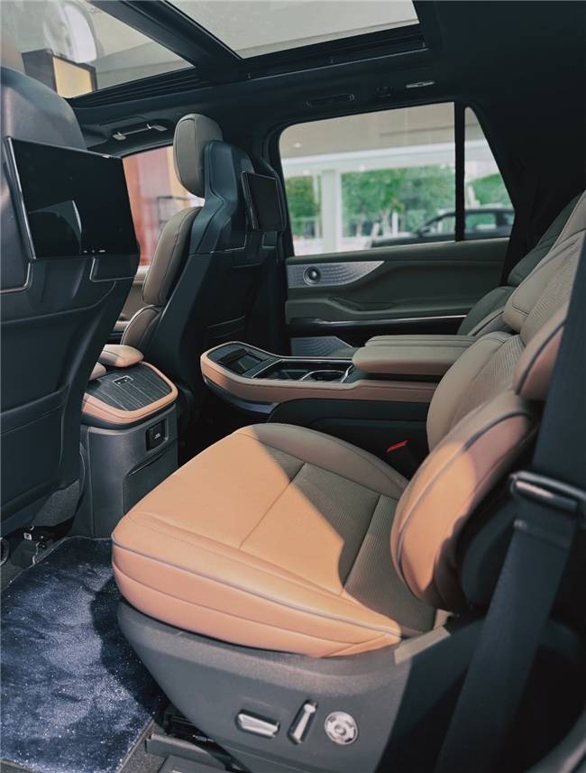 空間維度堪稱領(lǐng)航員的“拿手好戲”。車長(zhǎng)超5.3米(標(biāo)軸5346mm,長(zhǎng)軸5648mm),軸距達(dá)3.3米(標(biāo)軸3111mm,長(zhǎng)軸3341mm),相比寶馬X7那3.105米的軸距,優(yōu)勢(shì)肉眼可見。一家老小出行,領(lǐng)航員的2+2+3七座布局,無論是二排“統(tǒng)帥座”復(fù)式大沙發(fā),還是可電動(dòng)調(diào)節(jié)靠背角度、配備獨(dú)立空調(diào)出風(fēng)口與USB充電接口的第三排,都能讓每位乘客舒展自如、坐著特別舒服,真正告別“偽七座”的局促。