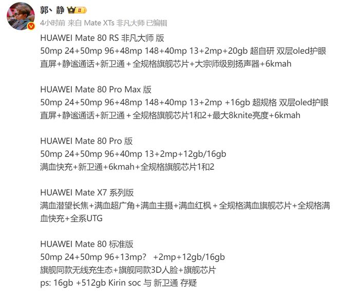華為Mate80系列已經確定要在11月25號發布了,一共有從普通版到RS非凡大師這五款機型,配置信息也慢慢都清楚了。
