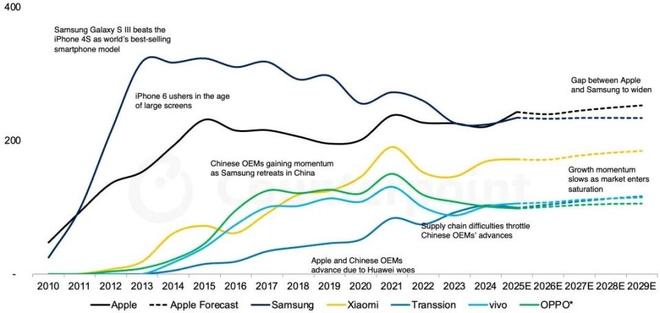 這是自2011年以來,蘋果首次在年度出貨量上反超三星,而且這一領先優勢預計將延續至2029年。