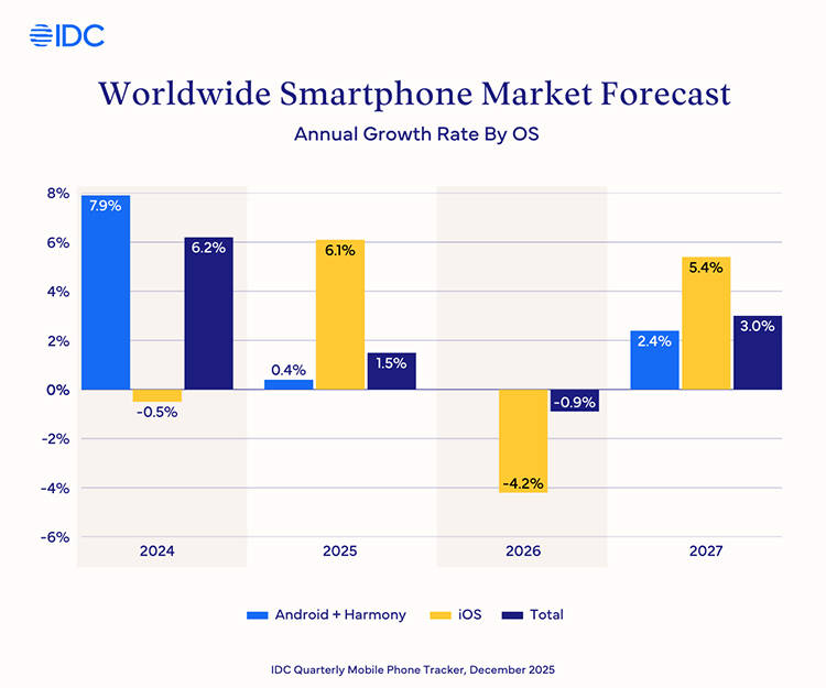 對于蘋果,今年iPhone 17系列大賣透支了明年的部分需求,而且蘋果明年還要調整發布節奏,將每年秋季發布會亮相的基礎版iPhone 18移到下一年春季發布,取而代之的是更貴的折疊屏iPhone。 有觀點認為,基礎版iPhone的缺位會讓蘋果損失一大塊蛋糕。 所以,多個因素導致蘋果明年的數據不會太好看。 但熬過了明年后,IDC預測2027年全球智能手機市場將迎來3%的增長。
