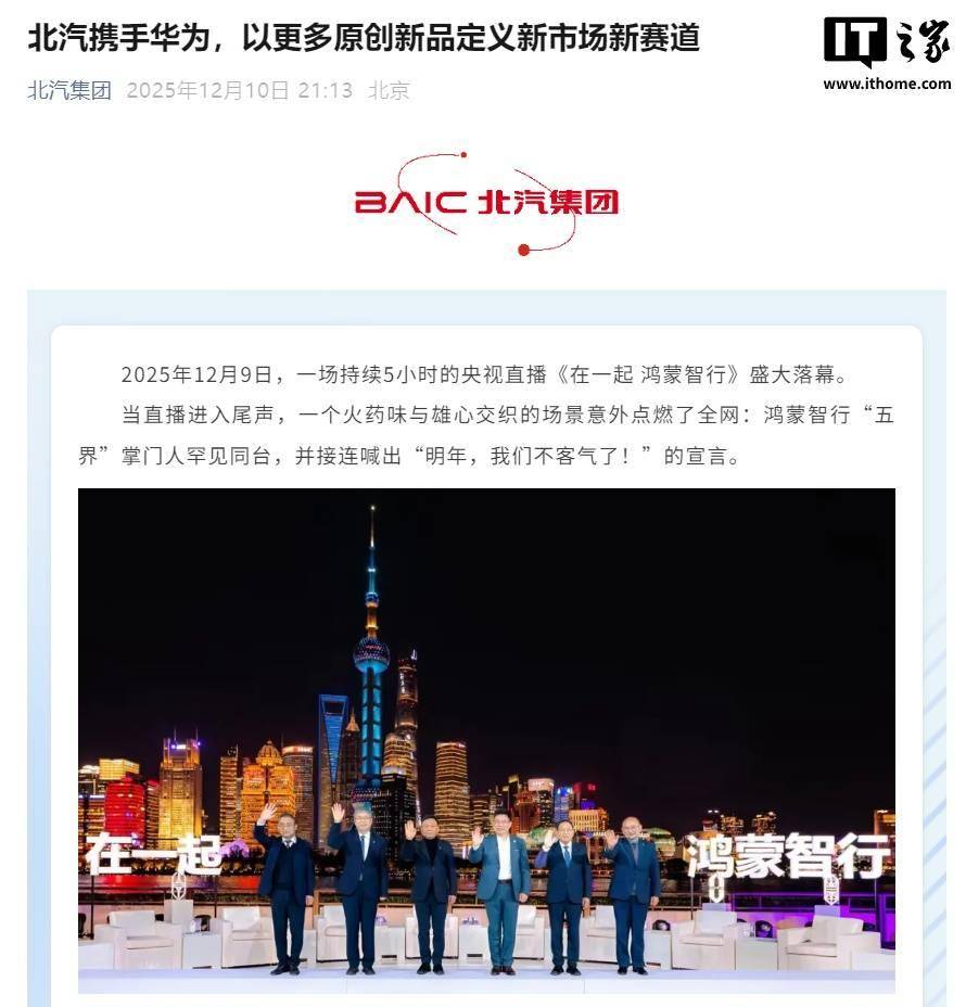 12 月 10 日消息,在 12 月 9 日的鴻蒙智行年度直播中,華為常務董事、產品投資委員會主任、終端 BG 董事長余承東攜手問界、智界、享界、尊界、尚界五大品牌掌門人首次同臺。