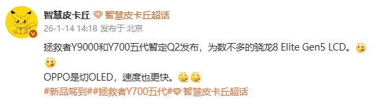 1月14日,數碼博主@智慧皮卡丘 爆料稱,聯想第五代拯救者Y9000電腦與Y700平板將于今年第二季度發布。其中,第五代拯救者Y700平板將搭載驍龍8 Elite Gen5移動平臺,采用LCD屏。