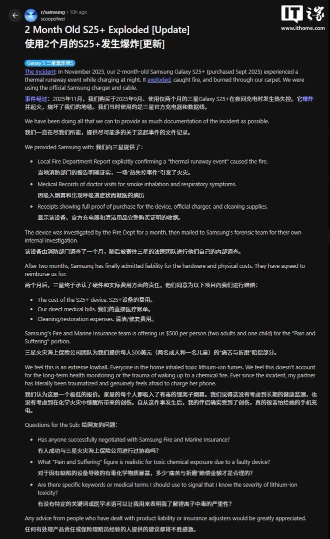 用戶透露,經過約兩個月的調查,三星目前已承認對該起事故負有責任。據其在社交平臺 Reddit 發布的帖子顯示,三星已同意賠償受損的 Galaxy S25 Plus 手機費用、支付該家庭的直接醫療賬單,并承擔與火災損壞相關的清潔和修復開支。